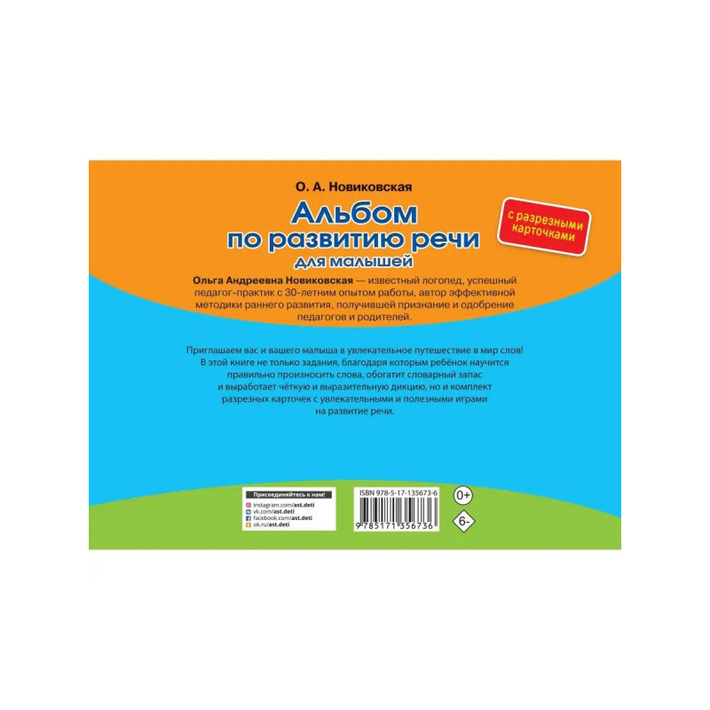 Альбом с разрезными карточками по развитию речи для малышей это сборник развивающих заданий для самых маленьких. Артикуляционные упражнения, дыхательная и голосовая гимнастика, пальчиковые игры всё это поможет малышам развить речь, расширить активный и пассивный словарный запас, сформировать чёткую и выразительную дикцию. Кому эта книга будет интересна Сборник развивающих упражнений для детей от полутора до трёх лет. Каковы особенности этой книги Увлекательные игры-задания с красочными иллюстрациями. 16 полос с разрезными карточками. Упражнения подобраны с учётом особенностей интеллектуального развития ребёнка-дошкольника.