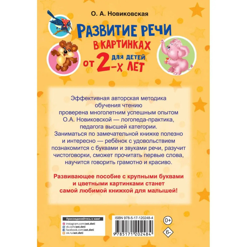 О чем эта книга Вы держите в руках новую книгу по развитию речи Ольги Андреевны Новиковской известного логопеда, успешного педагога-практика с 3-летним опытом работы. Кому эта книга будет интересна Уникальное пособие разработано в помощь родителям и педагогам, книга предназначена для совместных занятий взрослого и ребенка. Каковы особенности этой книги Уникальная методика развития речи позволит родителям познакомить малышей с буквами и звуками, научить их говорить красиво и правильно. Интересные игры с картинками подобраны с учетом возрастных особенностей детей раннего возраста. Веселые развивающие задания позволяют проводить уроки развития речи в игровой форме. Если вы хотите гордиться успехами своего малыша, эта книга для вас!
