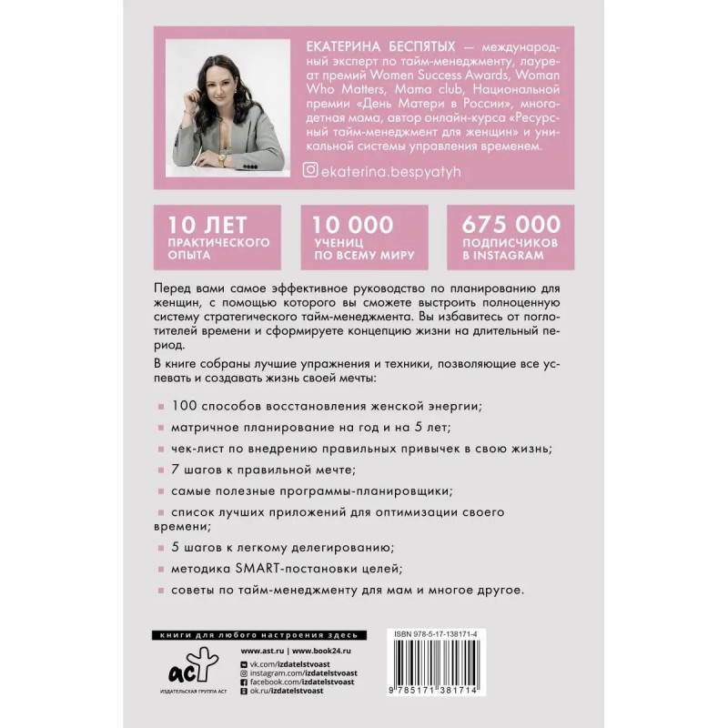 Перед вами самый эффективный учебник по тайм-менеджменту для женщин. Екатерина Беспятых автор уникальной системы управления временем, которая помогает достигать поставленных целей и гармонично совмещать работу с личной жизнью.Всё успеть! это система тайм-менеджмента, которая научит вас не только планировать свой день и неделю, но и выстраивать полную систему стратегического тайм-менеджмента. Вы не только избавитесь от поглотителей времени, но и узнаете самые важные лайфхаки, которые помогут сформировать концепцию жизни на день, месяц, год и более длительный период.В этой книге собраны секреты больших достижений лучшие упражнения и техники, позволяющие современной женщине все успевать и создавать жизнь своей мечты.