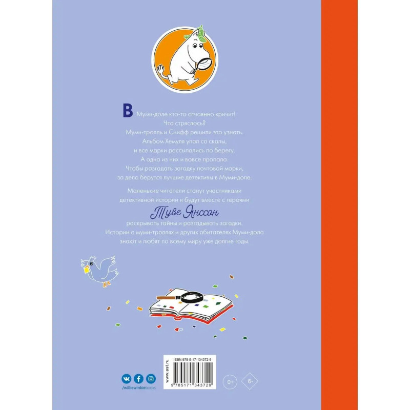 В Муми-доле кто-то отчаянно кричит! Что стряслось? Муми-тролль и Снифф решили это узнать. Ох! Альбом Хемуля упал со скалы и все марки рассыпались по берегу. А одна из них и вовсе пропала. Чтобы разгадать загадку почтовой марки, за дело берутся лучшие детективы в Муми-доле. Маленькие читатели станут участниками детективной истории и будут вместе с героями Туве Янссон раскрывать тайны и разгадывать загадки. Для детей до 3-х лет.
