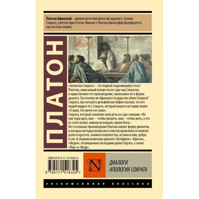 Платон Афинский древнегреческий философ-идеалист, ученик Сократа, учитель Аристотеля. Именно с Платона философия формируется как система знания. "Апология Сократа" - это первый сохранившийся текст Платона, написанный вскоре после суда над Сократом и единственное его произведение, написанное не в форме диалога. Так почему же Афинское государство убило Сократа? Сократа, про которого дельфийская пифия сказала, что нет людей мудрее его. Сократа, который вошел в историю своим "Я знаю, что ничего не знаю". Сократа, который закончил свою речь на суде словами: "Но уже пора идти, мне - чтобы умереть, вам чтобы жить, а что из этого лучше, никому неведомо, кроме бога". Все остальные произведения Платона имеют форму диалогов, в которых методом вопросов и ответов проясняются понятия долга и красоты, знания и невежества, истины и лжи, добра и зла. В сборник включены диалоги "Евтифрон", "Критон", "Федон", посвященные последним дням Сократа, а также "Пир" и "Федр".