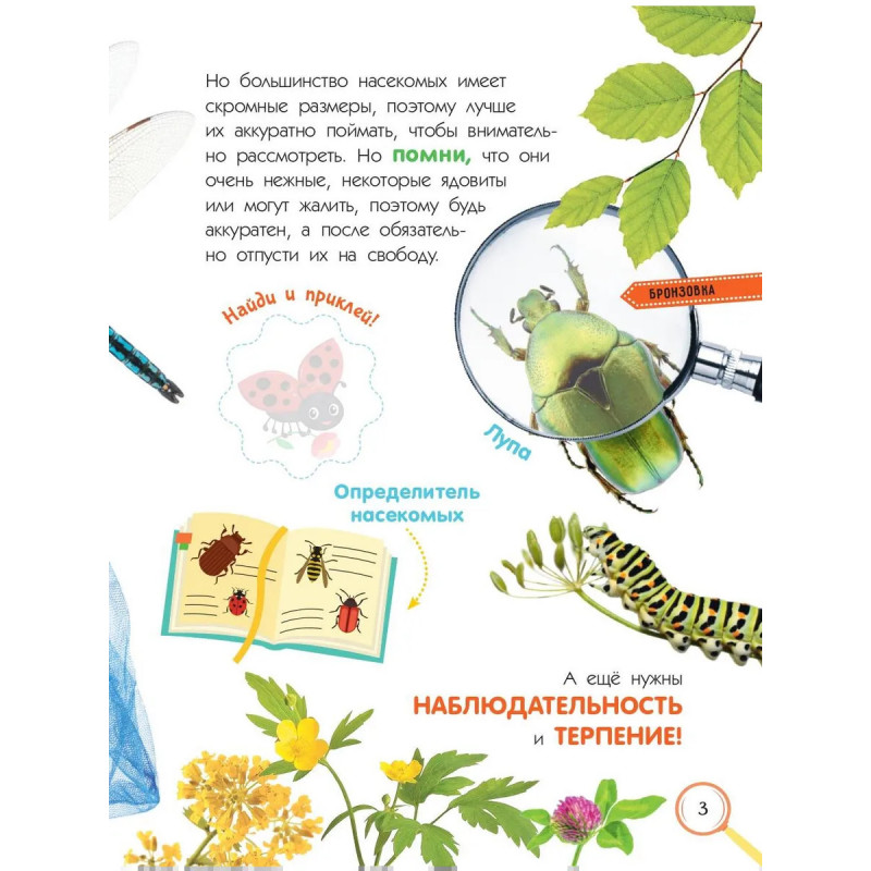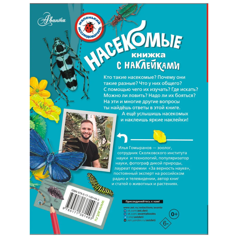 Увлекательная энциклопедия для юных любителей природы с наклейками и звуками насекомых внутри! Эта красочная книга расскажет о невероятном многомиллионном мире насекомых. С помощью этого издания ребёнок почувствует себя настоящим энтомологом и поймёт, как много интересного окружает нас в лесу, у реки, на лугу и даже в городе. Известный зоолог, энтомолог Илья Гомыранов откроет читателю удивительный мир насекомых и поможет сделать первые шаги в изучении природы. Книга развивает интерес ребёнка к науке, а также внимание и любовь к живой природе. Познавайте мир насекомых вместе!!!