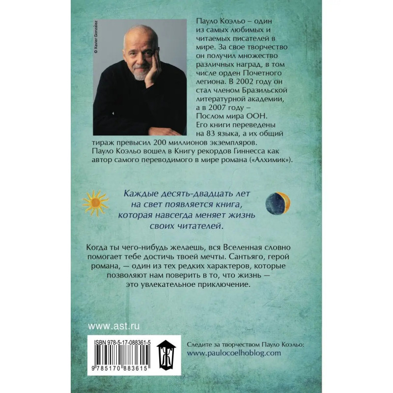 "Алхимик" самый известный роман бразильского писателя Пауло Коэльо, любимая книга миллионов людей во всем мире. В юности люди не боятся мечтать, все кажется им возможным. Но проходит время, и таинственная сила принимается им внушать, что их желания неосуществимы. "Добиться воплощения Своей Судьбы вот единственная подлинная обязанность человека..." утверждает Пауло Коэльо. Этот, ставший культовым, роман-притча способен изменить жизнь своих читателей.