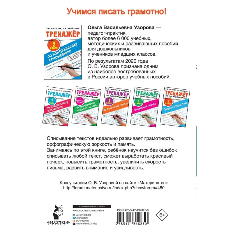 О чем эта книгаУчебное пособие известных педагогов-практиков О. В. Узоровой и Е. А. Нефёдовой позволит ученикам научиться без ошибок списывать любой текст, выработать красивый почерк, повысить грамотность, а также развить память и внимание.Кому эта книга будет интереснаОтличное пособие для учащихся начальной школы.Каковы особенности этой книги Списыванию отводится важная роль в освоении навыков правописания. Запоминать слова и предложения целиком полезно не только для формирования навыка списывания, но и для скорочтения. Ежедневные занятия развивают внимание, грамотность, зрительную память. Ребёнок может заниматься самостоятельно. Тренажёр можно использовать на уроках русского языка.