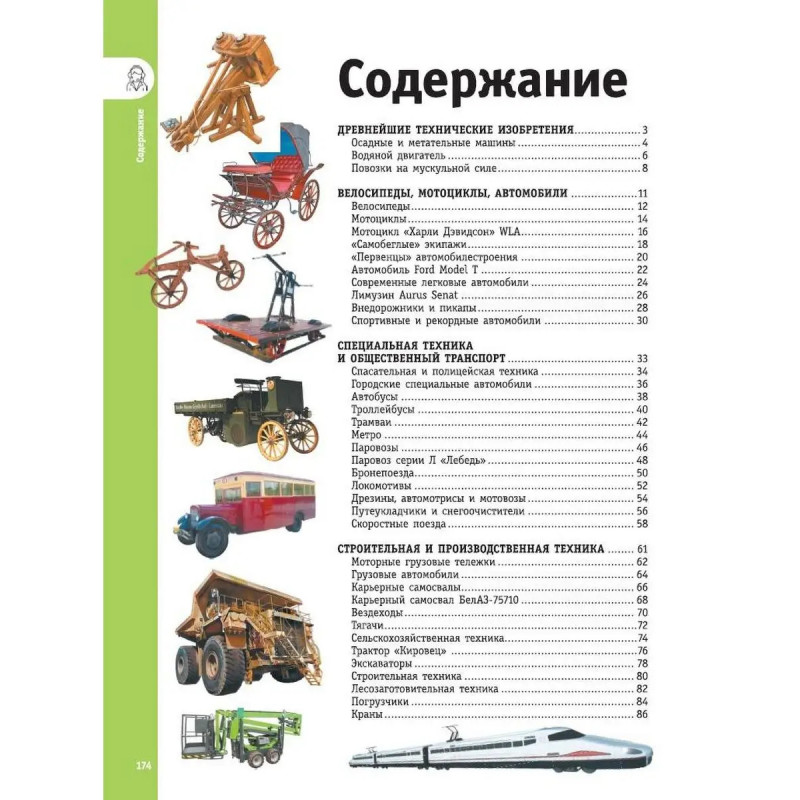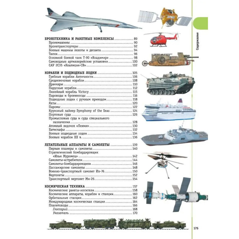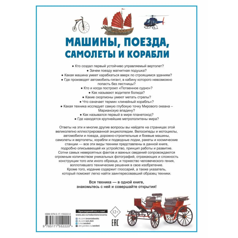 Велосипеды и мотоциклы, автомобили и поезда, дорожно-строительные машины и механизмы, ракеты и космические станции, корабли и подводные лодки, самолеты и вертолеты, боевые машины и ракетные комплексы все эти виды техники призваны тем или иным образом помогать человеку. Люди постоянно пользуются общественным транспортом, на морских лайнерах отправляются в путешествия по морям и океанам, а пассажирские самолеты быстро доставляют их в самые отдаленные уголки Земли. Есть и другая техника, без которой не обойтись, хотя мы и не так ощущаем ее присутствие в нашей жизни, это научные, боевые и другие машины спецназначения. А много ли мы вообще знаем о них? Эта увлекательная детская энциклопедия в картинках откроет для вас удивительный мир техники. В книге описано, как устроены, работают и совершенствуются различные машины, приведено множество важных, интересных, а порой даже неожиданных фактов, которые помогут найти ответы на сотни вопросов, связанных с самыми разными образцами. А главное на страницах энциклопед