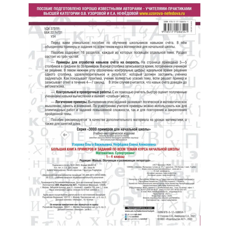 В этом уникальном пособии по обучению школьников навыкам счёта представлены примеры и задания по всем темам курса математики для начальной школы. Пособие состоит из 16 разделов, каждый из которых посвящен отдельной теме. Раздел состоит из трех частей: примеры для отработки навыков счета на скорость; логические примеры; контрольные и проверочные работы. Пособие можно использовать в качестве дополнительного материала на уроках математики, а также для занятий дома.. В. Узорова и Е.А Нефёдова известные педагоги-практики, авторы самых издаваемых учебников и учебных пособий в России. Основанные на авторской методике, доказавшей свою эффективность миллионными тиражами, эти пособия помогут родителям подготовить ребенка к школе, а ученикам легко и эффективно освоить программу начальной школы.