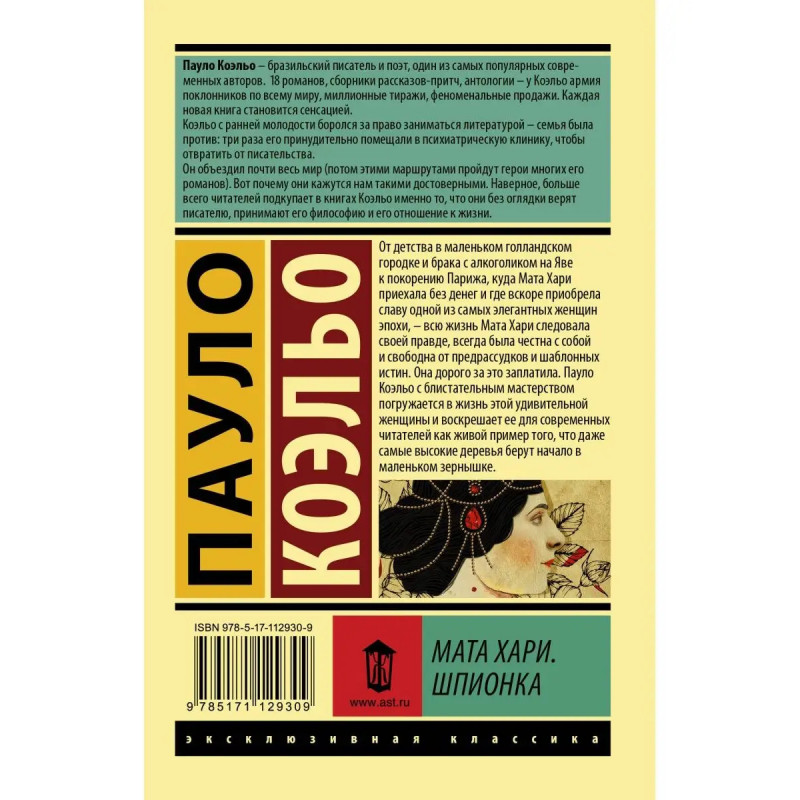 Пауло Коэльо один из самых любимых и читаемых писателей в мире. За свое творчество он получил множество различных наград, в том числе орден Почетного легиона. В 22 году он стал членом Бразильской литературной академии, а в 27 году Послом мира ООН. Его книги переведены на 81 язык, а их общий тираж превысил 2 миллионов экземпляров. Пауло Коэльо вошел в Книгу рекордов Гиннесса как автор самого переводимого в мире романа (Алхимик). ЕЕ ЕДИНСТВЕННОЕ ПРЕСТУПЛЕНИЕ В ТОМ, ЧТО ОНА БЫЛА НЕЗАВИСИМОЙ ЖЕНЩИНОЙ. От детства в маленьком голландском городке и брака с алкоголиком на Яве к покорению Парижа, куда Мата Хари приехала без денег и где вскоре приобрела славу одной из самых элегантных женщин эпохи, всю жизнь Мата Хари следовала своей правде, всегда была честна с собой и свободна от предрассудков и шаблонных истин. Она дорого за это заплатила. Пауло Коэльо с блистательным мастерством погружается в жизнь этой удивительной женщины и воскрешает ее для современных читателей как живой пример того, что