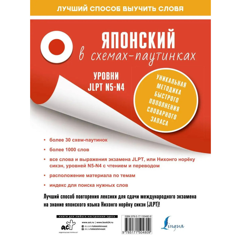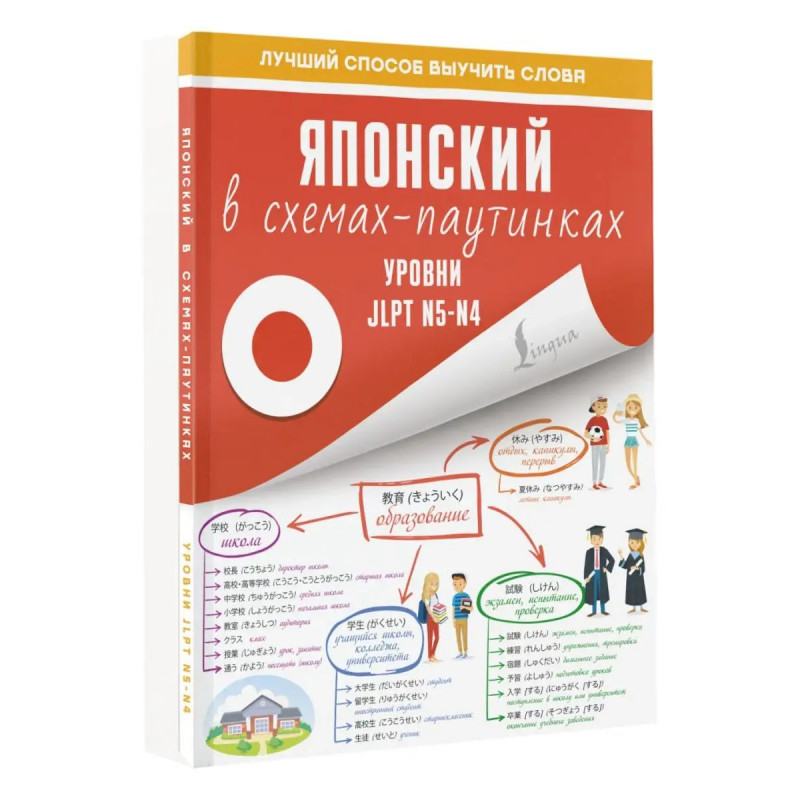 Японский в схемах-паутинках это уникальная методика запоминания слов, которая систематизирует пополнение словарного запаса и делает процесс обучения легким и увлекательным. Пособие содержит более 3 наглядных схем, включающих все слова, необходимые для сдачи международного экзамена на знание японского языка Нихонго норёку сикэн начальных уровней N5 и N4. Слова сгруппированы по темам и в каждой теме объединяются вокруг ключевого понятия. Прозрачная структура схем-паутинок позволяет увидеть связи между словами одной тематики и легко их запомнить. Для удобного поиска слов в конце книги приводится алфавитный указатель. Издание будет полезно всем начинающим изучать японский язык, а также тем, кто готовится к сдаче экзамена Нихонго норёку сикэн (N5-N4).