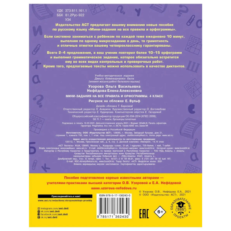 Пособие представляет собой сборник заданий по русскому языку на все темы, которые проходят в 4 классе. Если системно заниматься по каждой теме ежедневно 10 минут, выполняя по одному микро-заданию в день, то грамотность и отличные отметки вашему четверокласснику гарантированы. Данные мини-задания комфортны для выполнения: ребёнок не устаёт и с удовольствием садится выполнять такие задания. А родители, видя простоту и доступность заданий, также охотно позанимаются с ребёнком и проверят его знания.Польза от такой работы огромна, так как все слова текстов практически состоят из одних орфограмм. Всего 24 предложения, а ваш ученик повторил более 1015 орфограмм и выполнил грамматическое задание, которое обязательно встретится ему во всех видах контрольных работ. Кроме того, предлагаемые тексты можно использовать в качестве диктантов.По пособию будет также полезно заниматься в выходные и в каникулы.