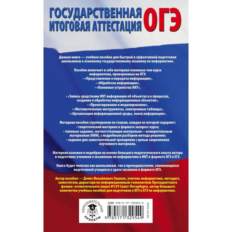 Данная книга учебное пособие для быстрой и эффективной подготовки школьников к основному государственному экзамену по информатике. Пособие включает в себя материал основных тем курса информатики, проверяемых на ОГЭ: "Представление и передача информации", "Обработка информации", "Основные устройства ИКТ", "Запись средствами ИКТ информации об объектах и о процессах, создание и обработка информационных объектов", "Проектирование и моделирование", "Математические инструменты, электронные таблицы", "Организация информационной среды, поиск информации". Материал пособия сгруппирован по главам, каждая из которой содержит: теоретический материал в формате экспресс-курса; типовые задания, соответствующие контрольно-измерительным материалам (КИМ), с подробным разбором метода решения; задания для самостоятельной тренировки с целью закрепления изученного материала. Материал изложен и подобран на основе большого педагогического опыта автора в подготовке учеников к экзаменам по информатике
