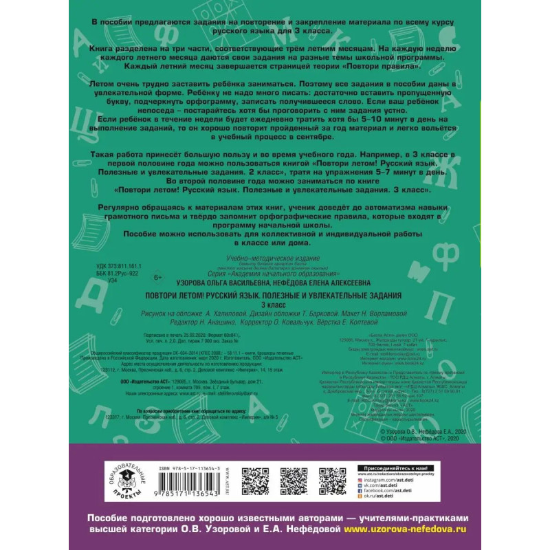 В пособии предлагаются задания на повторение и закрепление материала по всему курсу русского языка для 3 класса.Книга разделена на три части, соответствующие трём летним месяцам. На каждую неделю каждого летнего месяца даются свои задания на разные темы школьной программы. Каждый летний месяц завершается страницей теории Повтори правила. Летом очень трудно заставить ребёнка заниматься. Поэтому все задания в пособии даны в увлекательной форме. Ребёнку не надо много писать: достаточно вставить пропущенную букву, подчеркнуть орфограмму, записать получившееся слово. Если ваш ребёнок непоседа постарайтесь хотя бы проговорить с ним задания устно.Если ребёнок в течение недели будет ежедневно тратить хотя бы 510 минут в день на выполнение заданий, то он хорошо повторит пройденный за год материал и легко вольётся в учебный процесс в сентябре.