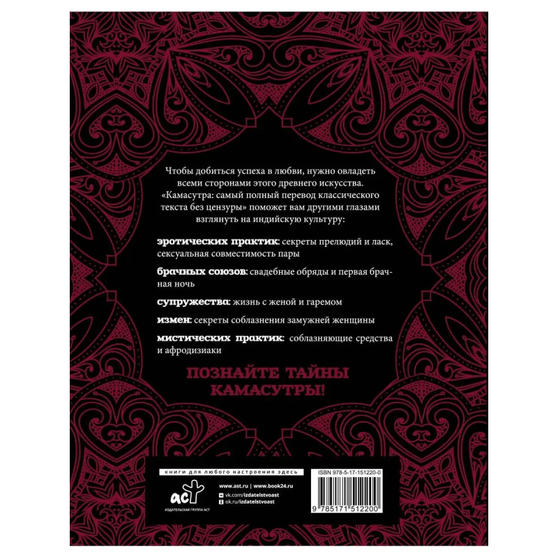 Чтобы добиться успеха в любви, нужно овладеть всеми сторонами этого древнего искусства. "Камасутра: самый полный перевод классического текста без цензуры" поможет вам другими глазами взглянуть на индийскую культуру: - эротических практик: секреты прелюдий и ласк, сексуальная совместимость пары - брачных союзов: свадебные обряды и первая брачная ночь - супружества: жизнь с женой и гаремом - измен: секреты соблазнения замужней женщины - мистических практик: соблазняющие средства и афродизиаки Книга сопровождается цветными древнеиндийскими иллюстрациями и станет отличным подарком для второй половинки! Познайте тайны Камасутры!