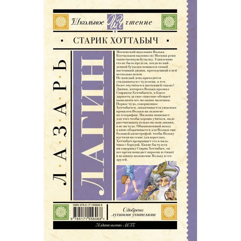 Лазарь Иосифович Лагин (193 1979) советский писатель и поэт. Повесть-сказка "Старик Хоттабыч" (1938) печаталась по частям сначала в газете"Пионерская правда", а затем в журнале "Пионер". Московский школьник Волька Костыльков, купаясь в речке, находит таинственную бутылку. Удивлению Вольки не было предела, когда вместо клада, он нашел в старинной бутылке джинна. Старый джинн по имени Гассан Абдурахман ибн Хоттаб за свое освобождение пообещал преданно служить Вольке и выполнять все его пожелания. Но пионеру Костылькову не нужны дворцы и несметные богатства Хоттабыча. Волька учит старика грамоте, устраивает на работу в цирк, "делает из него настоящего человека". Хоттабыч в свою очередь помогает Вольке научиться ценить дружбу и отвечать за свои поступки. Для детей среднего школьного возраста.
