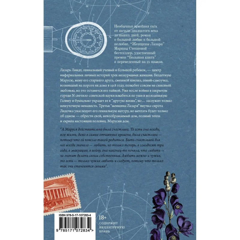 Марина Степнова - прозаик, переводчик с румынского (в том числе популярнейшей в нашей стране пьесы "Безымянная звезда" М. Себастиана). Ее рассказы охотно печатают журналы "Новый мир" и "Звезда", роман "Хирург" (лонг-лист премии "НАЦИОНАЛЬНЫЙ БЕСТСЕЛЛЕР") сравнивали с "Парфюмером" П.Зюскинда. Новый роман "Женщины Лазаря" - необычная семейная сага от начала века до наших дней. Это роман о большой ЛЮБВИ и большой НЕ-ЛЮБВИ. Лазарь Линдт, гениальный ученый и большой ребенок, "беззаконная комета в кругу расчисленных светил", - центр инфернальных личных историй трех незаурядных женщин. Бездетную Марусю, жену его старшего друга, смешной юноша, гений-самоучка, возникший на пороге ее дома в 1918 году, полюбит совсем не сыновней любовью, но это останется его тайной. Уже после войны в закрытом городе N светило советской науки влюбится по уши в молоденькую Галину и буквально украдет в "другую жизнь", но заслужит только нешуточную ненависть. Третья "женщина Лазаря" внучка -сирота Лидочка унаследует его гениальную натуру,