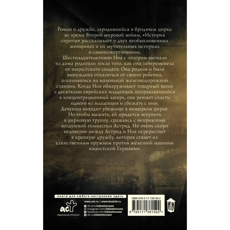 Бестселлер The New York Times! Невероятная история о соперничестве и силе настоящей дружбы, спасающей даже в самые темные времена. Исторический роман поведает об одном из самых отчаянных и смелых человеческих подвигов времен Второй мировой войны. Пэм Дженофф работала в Пентагоне и участвовала в операциях на самых высоких правительственных уровнях. Во время работы в Польше Пэм заинтересовалась изучением Холокоста и польско-еврейских отношений. В шестнадцать лет Ноа выгнали из дома родители за порочную связь с нацистским солдатом. Ей пришлось отказаться от ребенка, родившегося в результате этого союза, и навсегда уехать из Голландии. Судьба забрасывает ее в Германию, где девушка находит временное пристанище и работу на вокзале. Однажды Ноа спасает ребенка из товарного вагона, в котором еврейских младенцев перевозят в концлагерь, и решает сбежать с ним. Она находит прибежище в немецком цирке, где встречает воздушную гимнастку Астрид. Настоящее имя женщины Ингрид, она еврейка и потому вынуждена скры