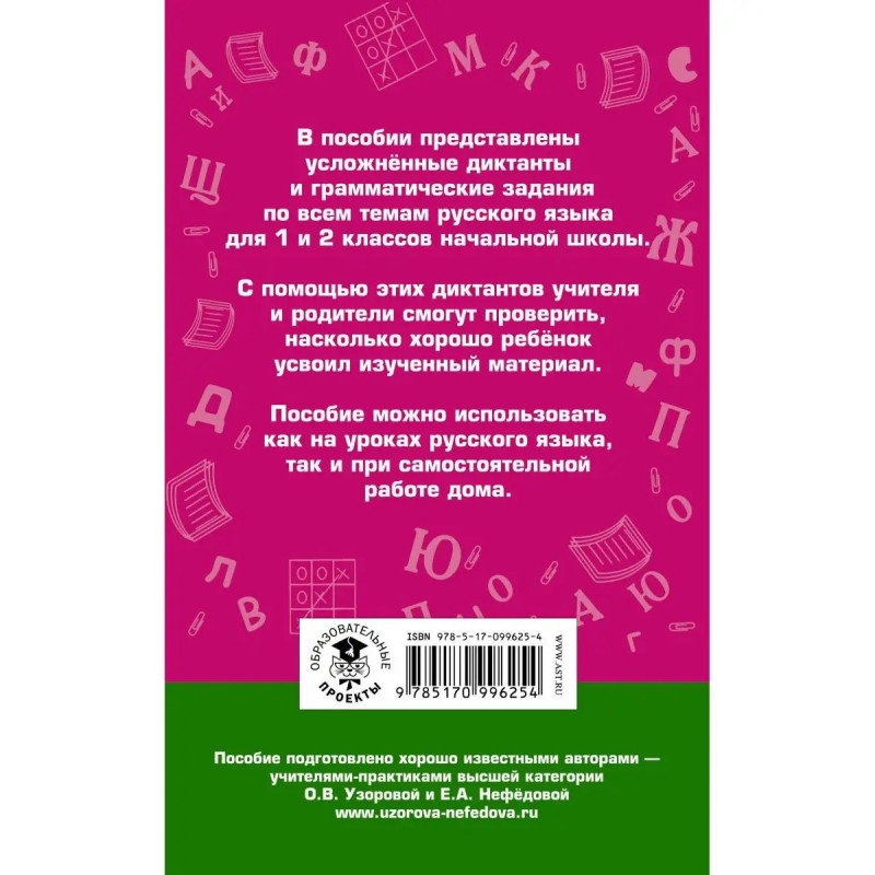 В пособии известных педагогов-практиков, авторов самых издаваемых учебников и учебных пособий в России О.В. Узоровой и Е.А. Нефёдовой представлены усложненные диктанты и грамматические задания по всем темам русского языка для 1 и 2 классов. Диктант один из основных видов обучения грамотному письму для закрепления навыков и проверки знаний учащихся. С помощью этого пособия учителя и родители смогут проверить, насколько хорошо ребенок усвоил изучаемый материал.