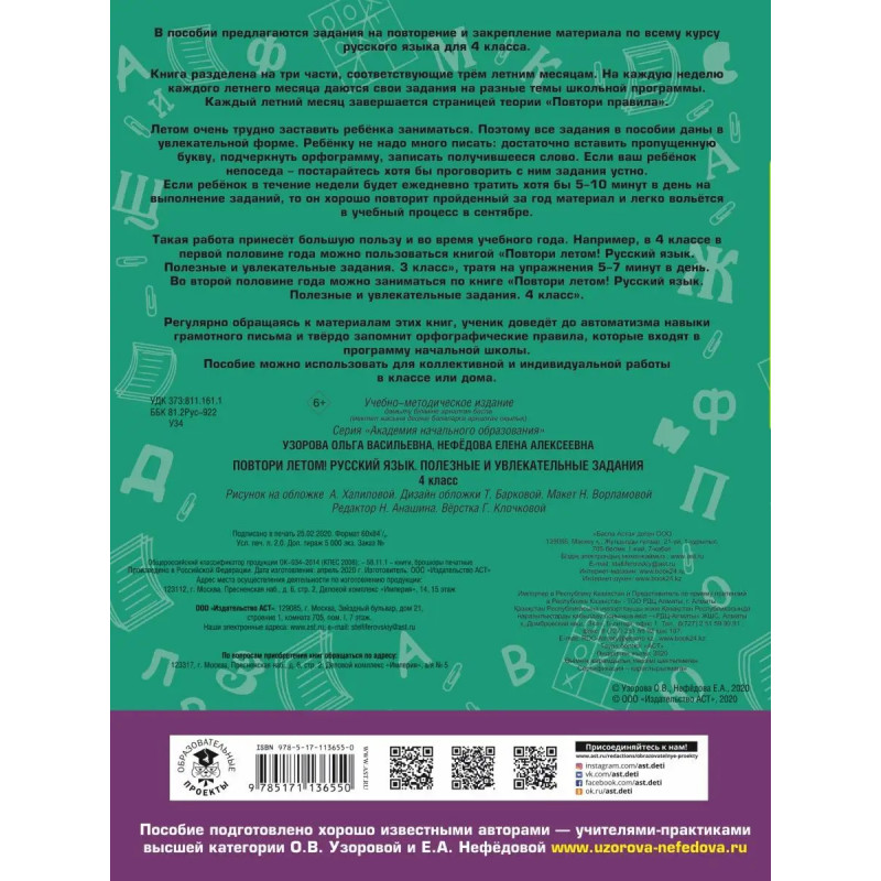 В пособии предлагаются задания на повторение и закрепление материала по всему курсу русского языка для 4 класса.Книга разделена на три части, соответствующие трём летним месяцам. На каждую неделю каждого летнего месяца даются свои задания на разные темы школьной программы. Каждый летний месяц завершается страницей теории Повтори правила. Летом очень трудно заставить ребёнка заниматься. Поэтому все задания в пособии даны в увлекательной форме. Ребёнку не надо много писать: достаточно вставить пропущенную букву, подчеркнуть орфограмму, записать получившееся слово. Если ваш ребёнок непоседа постарайтесь хотя бы проговорить с ним задания устно.Если ребёнок в течение недели будет ежедневно тратить хотя бы 510 минут в день на выполнение заданий, то он хорошо повторит пройденный за год материал и легко вольётся в учебный процесс в сентябре.