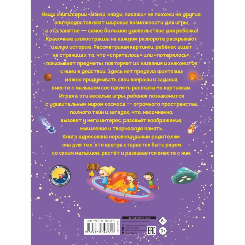 Вы держите в руках не просто книгу под названием "Космос". Это большая игра. Ведь именно в игре ребёнок знакомится сокружающим миром, развивает воображение, тренирует память, учится размышлять и творчески подходить к решению разных задач. Каждый разворот издания полон красочных иллюстраций, логически объединённых одним сюжетом на тему космоса рассказом об удивительных явлениях, которые происходят во Вселенной. Играя, ребёнок с легкостью запомнит названия планет и других небесных тел, узнает, чем они отличаются друг от друга, даже назовёт процессы, которые с ними происходят, научится рассуждать и отвечать на вопросы. А если ему пока трудно найти что-то на странице мама всегда поможет. Подарите своему малышу весёлые минуты увлекательной игры! Для дошкольного возраста.
