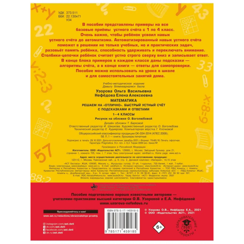 Пособие известных педагогов-практиков, авторов самых издаваемых учебников и учебных пособий в России О.В. Узоровой и Е.А. Нефёдовой поможет ребенку овладеть базовыми приемами устного счёта, предусмотренными программой начальной школы. Столбики-цепочки ребёнок считает устно строго сверху вниз и записывает ответ. В конце блока примеров в каждом классе даны подсказки алгоритмы счёта, а в конце книги ответы для самопроверки. Регулярно выполняя задания пособия, ребёнок усвоит навык устного счёта до автоматизма. Пособие можно использовать на уроке в школе и для самостоятельных занятий дома.