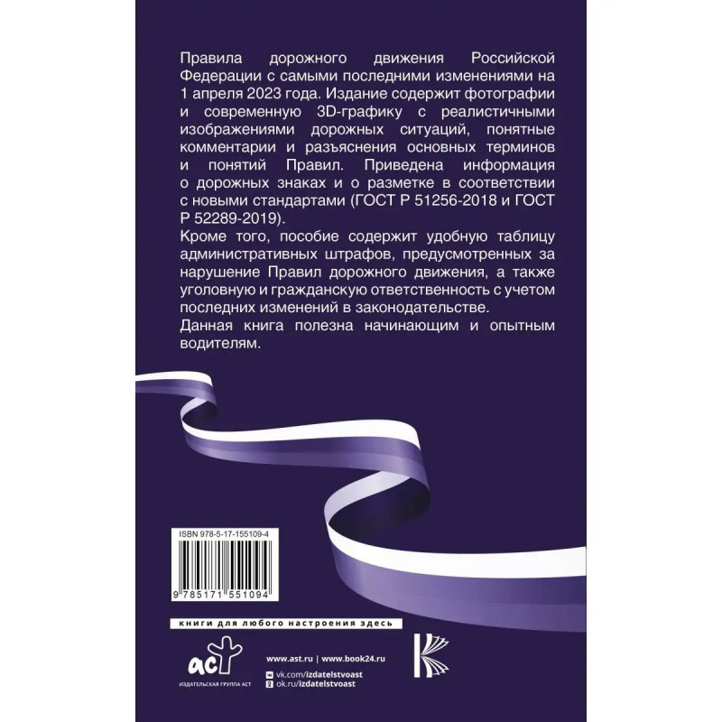 Правила дорожного движения Российской Федерации с самыми последними изменениями на 1 апреля 223 года с учетом всех изменений и дополнений, включая правила пользования средствами индивидуальной мобильности (электросамокатами, электроскейтбордами, гироскутерами, сигвеями, моноколесами и иными аналогичными средствами). Издание содержит фотографии и современную 3D-графику с реалистичными изображениями дорожных ситуаций, понятные комментарии и разъяснения основных терминов и понятий Правил. Приведена информация о дорожных знаках и о разметке в соответствии с новыми стандартами (ГОСТ Р 51256-218 и ГОСТ Р 52289-219). Кроме того, пособие содержит удобную таблицу административных штрафов, предусмотренных за нарушение Правил дорожного движения, а также уголовную и гражданскую ответственность с учетом последних изменений в законодательстве. Данная книга полезна начинающим и опытным водителям. пдд 223, для автомобиля в салон, подарок мужчине, подарок на 23 февраля, подарок на 14 февраля, подарок парню, подарок на 14 фе