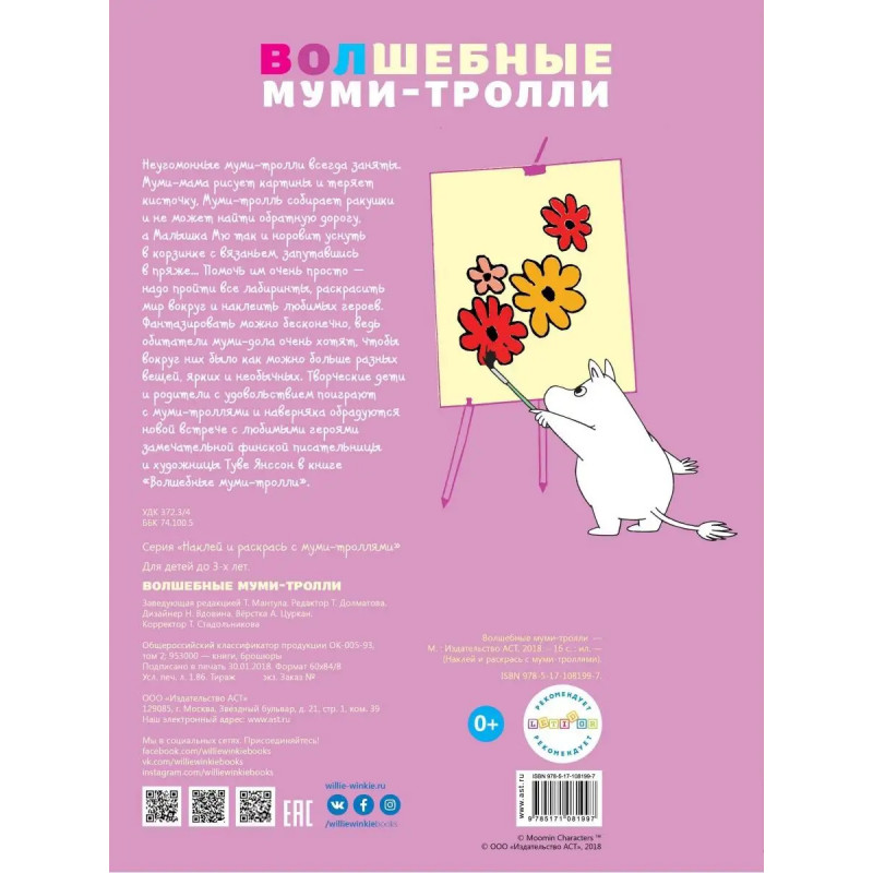 Редакция Вилли Винки представляет! Неугомонные муми-тролли всегда заняты. Муми-мама рисует картины и теряет кисточку, Муми-тролль собирает ракушки и не может найти обратную дорогу, а Малышка Мю так и норовит уснуть в корзинке с вязаньем, запутавшись в пряже... Помочь им очень просто надо пройти все лабиринты, раскрасить мир вокруг и наклеить любимых героев. Фантазировать можно бесконечно, ведь обитатели муми-дола очень хотят, чтобы вокруг них было как можно больше разных вещей, ярких и необычных. Творческие дети и родители с удовольствием поиграют с муми-троллями и наверняка обрадуются новой встрече с любимыми героями замечательной финской писательницы и художницы Туве Янссон в книге Волшебные муми-тролли.