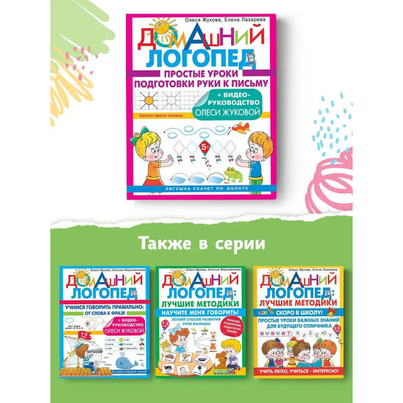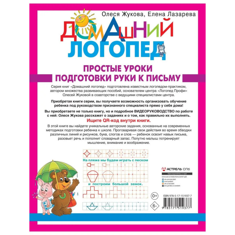 Лучшие логопеды-практики для ваших детей! Первый год обучения в школе самый насыщенный и сложный для ребенка. Чтобы избавить юного ученика от многих трудностей, необходимо начинать занятия еще в дошкольном возрасте, в комфортных для малыша условиях. Заботливые взрослые именно так и поступают. Умение правильно держать ручку или карандаш, ориентироваться на листе бумаги важнейший навык для дошкольника. Среди множества прописей эта книга выделяется тем, что все задания многократно опробованы на занятиях логопедов с детьми. К тому же ребенок будет не просто рисовать линии, обводить рисунки, буквы, слоги и слова, но попутно проговаривать свои действия, что является отличным способом развития речи. А чтобы правильно организовать занятия, сделать их по-настоящему полезными обязательно посмотрите ВИДЕО-РУКОВОДСТВО, записанное автором Олесей Жуковой. Для этого надо всего лишь отсканировать QR-код, расположенный в книге.