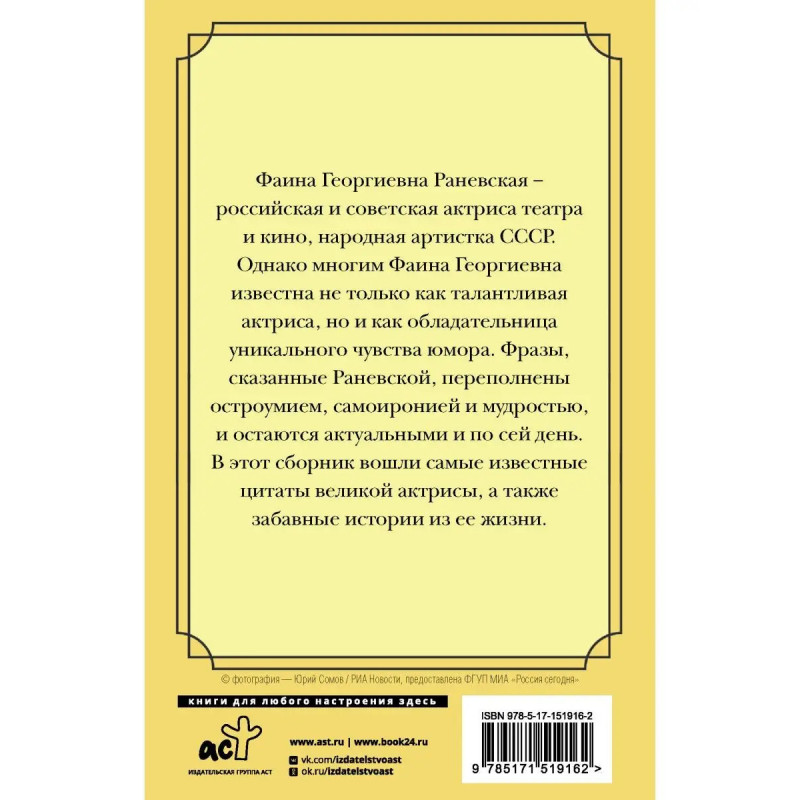 Фаина Георгиевна Раневская российская и советская актриса театра и кино, народная артистка СССР. Однако известной она стала не только благодаря своему актерскому таланту, но и благодаря уникальному чувству юмора, в котором сочетались сарказм, самоирония и житейская мудрость. Цитаты Фаины Георгиевны остаются актуальным и по сей день, они одновременно вызывают улыбку и заставляют нас задуматься над самыми разными вещами. В этот сборник вошли самые известные цитаты великой актрисы, а также забавные истории из ее жизни.