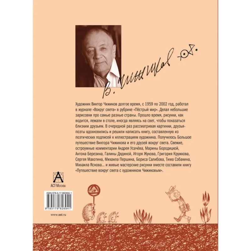 Книга представляет собой собрание никогда не публиковавшихся рисунков Виктора Чижикова на разные темы. Это и портреты, и карикатуры, и шаржи, и лирические пейзажи и зарисовки. Изящные рисунки-фантазии и рисунки-загадки. Несколько иллюстраций к книгам. Исполнены они в разных техниках: акварель, карандаш, тушь и гуашь что было под рукой, что оказалось под настроение. К этим прелестным зарисовкам девять известных, талантливых, остроумных поэтов написали стихи. Это Галина Дядина, Марина Бородицкая, Игорь Жуков, Михаил Яснов, Сергей Махотин, Марина Дружинина, Михаил Першин, Григорий Кружков и Андрей Усачев. Получилась книга про жизнь. Местами печальную и безысходную. Местами смешную до слез и простую до величия.