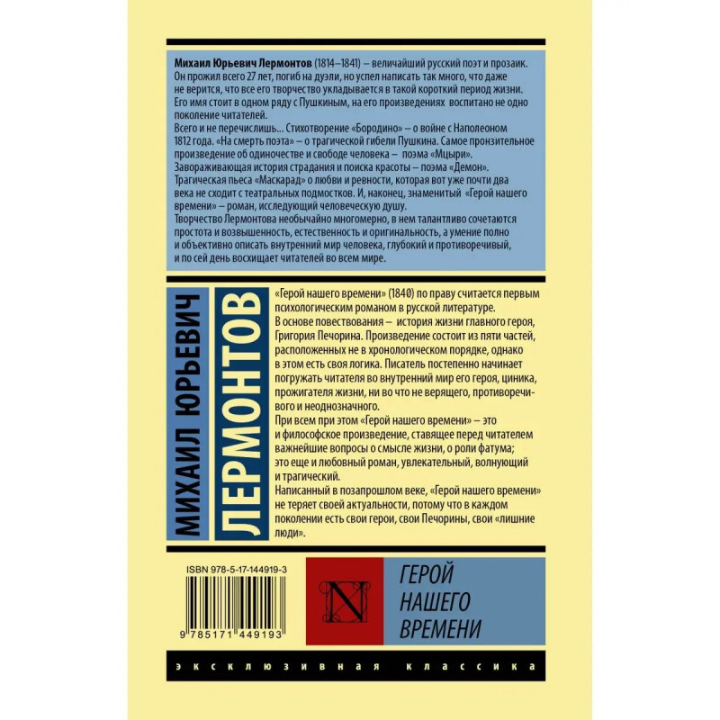"Герой нашего времени" (184) по праву считается первым психологическим романом в русской литературе. В основе повествования история жизни главного героя, Григория Печорина. Произведение состоит из пяти частей, расположенных не в хронологическом порядке, однако в этом есть своя логика. Писатель постепенно начинает погружать читателя во внутренний мир его героя, циника, прожигателя жизни, ни во что не верящего, противоречивого и неоднозначного. При всем при этом "Герой нашего времени" это и философское произведение, ставящее перед читателем важнейшие вопросы о смысле жизни, о роли фатума; это еще и любовный роман, увлекательный, волнующий и трагический. Написанный в позапрошлом веке "Герой нашего времени", не теряет своей актуальности, потому что в каждом поколении есть свои герои, свои Печорины, свои "лишние люди".