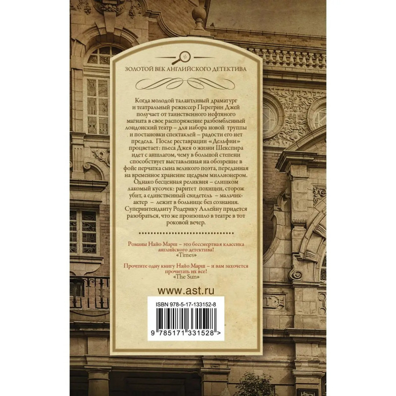 Когда молодой талантливый драматург и театральный режиссер Перегрин Джей получает от таинственного нефтяного магната в свое распоряжение разбомбленный лондонский театр для набора новой труппы и постановки спектаклей радости его нет предела. После реставрации "Дельфин" процветает: пьеса Джея о жизни Шекспира идет с аншлагом, чему в большой степени способствует выставленная на обозрение в фойе перчатка сына великого поэта, переданная на временное хранение щедрым миллионером. Однако бесценная реликвия слишком лакомый кусочек: раритет похищен, сторож убит, а единственный свидетель мальчик-актер лежит в больнице без сознания. Суперинтенданту Родерику Аллейну придется разобраться, что же произошло в театре в тот роковой вечер.