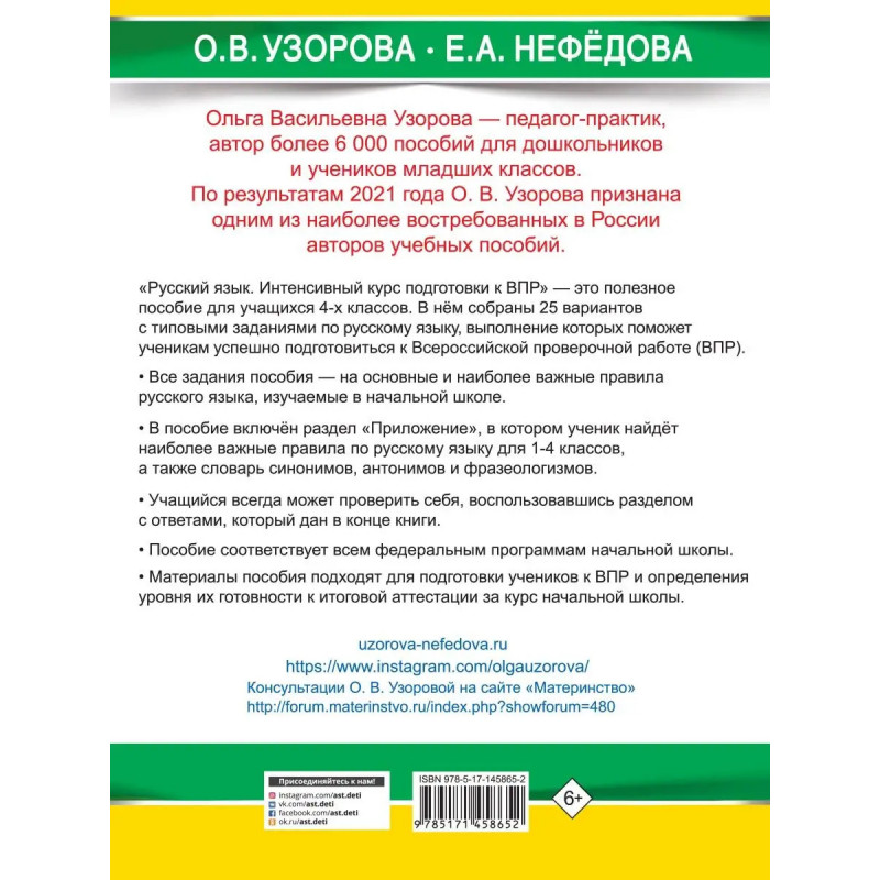 О чем эта книгаУчебное пособие известных педагогов-практиков О. В. Узоровой и Е. А. Нефёдовой для подготовки учащихся к итоговой аттестации по русскому языку за курс начальной школы.Кому эта книга будет интереснаДля учащихся начальных классов отличное дополнительное пособие.Каковы особенности этой книги Соответствует ФГОС для начальной школы. Поможет учащимся хорошо подготовиться к итоговой аттестации по математике за курс начальной школы. Даны варианты типовых заданий, критерии оценивания и ответы. Ребёнок может заниматься самостоятельно. Пособие можно использовать на уроках в классе, а также для работы дома.