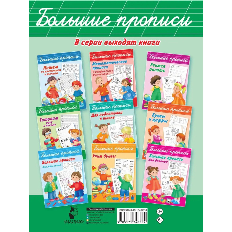 О чем эта книга Полный курс обучения письму прекрасный тренажер, который поомжет дошеольнику научиться писать письменные буквы. Пособие включает упражнения для развития мелкой моторики и графических навыков, внимания, памяти, мышления. Кому эта книга будет интересна Книга будет интересна любознательным дошколятам 56 лет. В помощь заботливым родителям для подготовки к школе. Особенности этой книги Дошколята познакомятся с азбукой и научатся писать письменные буквы, потренируются аккуратно обводить элементы букв, буквы, слоги и слова. Обучающие прописи развивают мелкую моторику и координацию движений руки, зрительное восприятие, внимание и память, расширяют кругозор, обогащают словарный запас. Выполнение графических упражнений развивает личностные качества старательность, усердие и аккуратность. Хотите видеть своего ребенка прилежным учеником занимайтесь по этим развивающим прописям.