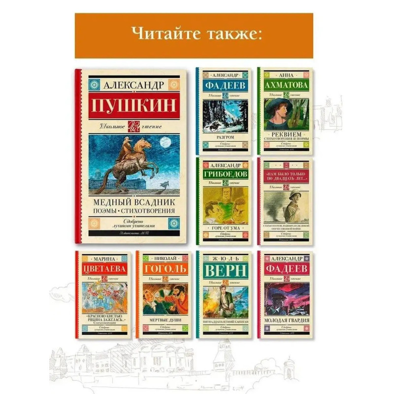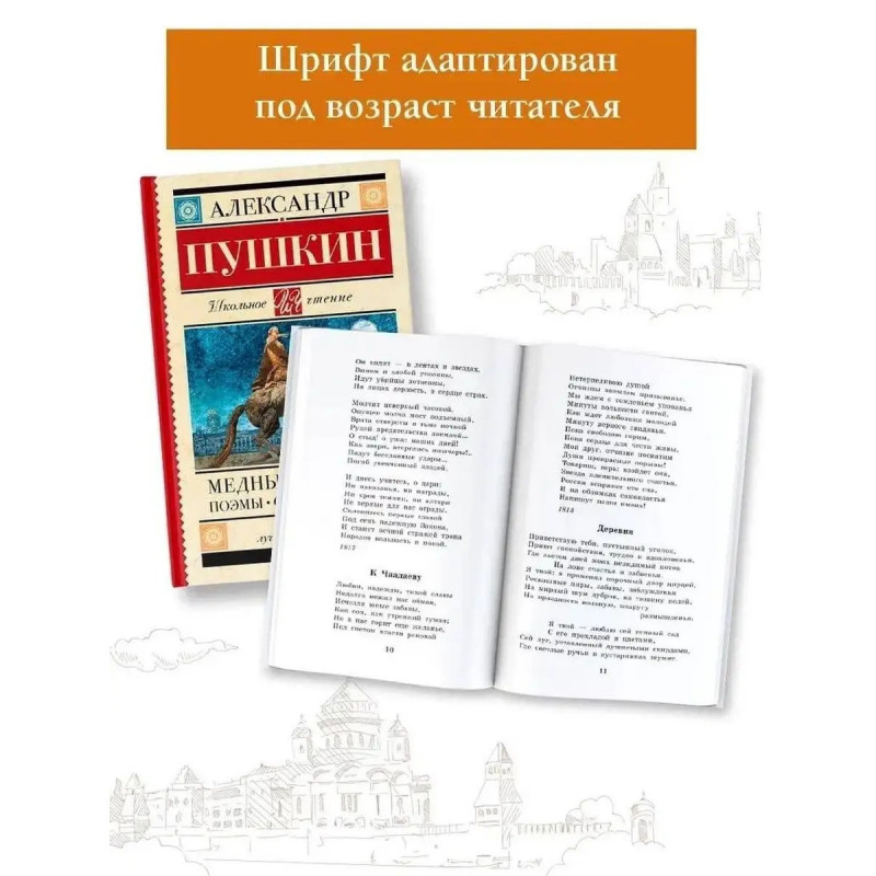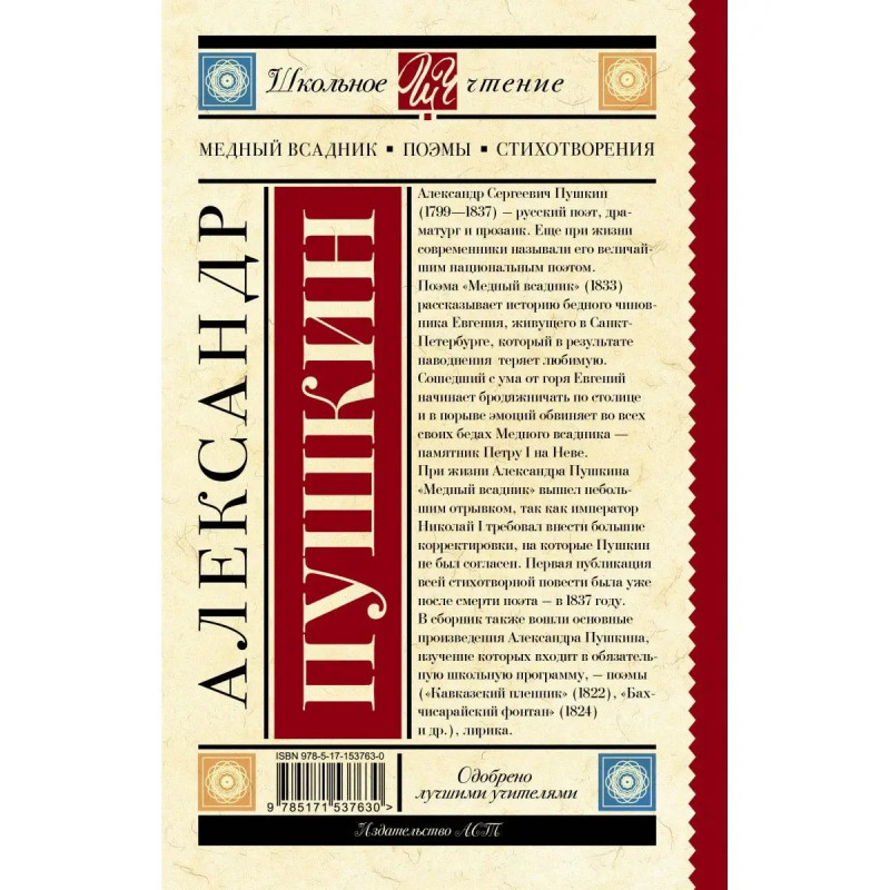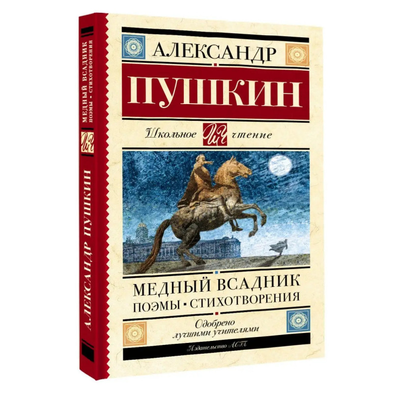 Александр Сергеевич Пушкин (17991837) русский поэт,драматург и прозаик. Еще при жизни современники называли его величайшим национальным поэтом. Поэма "Медный всадник" (1833) рассказывает историю бедного чиновника Евгения, живущего в Санкт-Петербурге, который в результате наводнения теряет любимую. Сошедший с ума от горя Евгений начинает бродяжничать по столице и в порыве эмоций обвиняет во всех своих бедах Медного всадника памятник Петру I на Неве. При жизни Александра Пушкина "Медный всадник" вышел небольшим отрывком, так как император Николай I требовал внести большие корректировки, на которые Пушкин не был согласен. Первая публикация всей стихотворной повести была уже после смерти поэта в 1837 году. В сборник также вошли основные произведения Александра Пушкина,изучение которых входит в обязательную школьную программу, поэмы ("Кавказский пленник" (1822), "Бахчисарайский фонтан" (1824) и др.), лирика.