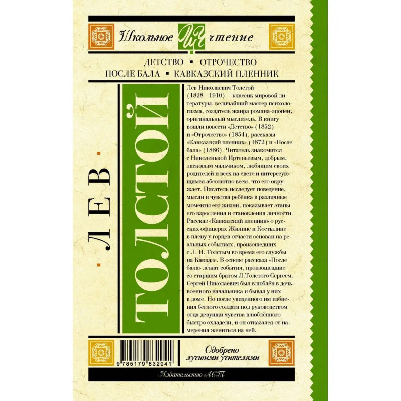Лев Николаевич Толстой (1828 - 191) - классик мировой литературы, величайший мастер психологизма, создатель жанра романа-эпопеи, оригинальный мыслитель. В книгу вошли повести Детство (1852) и Отрочество (1854), рассказы Кавказский пленник (1872) и После бала (1886). Читатель знакомится с Николенькой Иртеньевым, добрым, ласковым мальчиком, любящим своих родителей и всех на свете и интересующимся абсолютно всем, что его окружает. Писатель исследует поведение, мысли и чувства ребёнка в различные моменты его жизни, показывает этапы его взросления и становления личности. Рассказ Кавказский пленник о русских офицерах Жилине и Костылине в плену у горцев отчасти основан на реальных событиях, произошедших с Л. Н. Толстым во время его службы на Кавказе. В основе рассказа После бала лежат события, произошедшие со старшим братом Л. Толстого Сергеем. Сергей Николаевич был влюблён в дочь военного начальника и бывал у них в доме. Но после увиденного им избиения беглого солдата под руководством отца девушки, чув