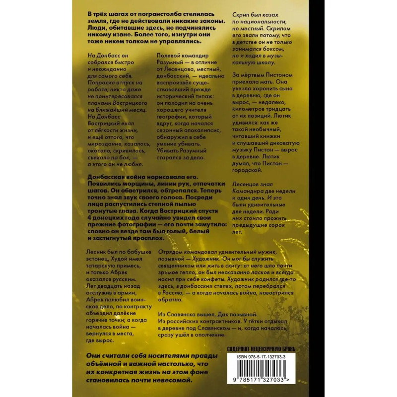 Захар Прилепин писатель, обладатель премий "Большая книга", "Национальный бестселлер" и "Ясная Поляна". Автор романов "Обитель", "Санькя", "Черная обезьяна", "Патологии", "Некоторые не попадут в ад", сборников рассказов "Грех", "Ботинки, полные горячей водкой", "Семь жизней" и "Восьмёрка", сборников публицистики "К нам едет Пересвет", "Летучие бурлаки", "Не чужая смута", "Всё, что должно разрешиться. Письма с Донбасса", "Взвод", "Истории из лёгкой и мгновенной жизни", "Имя рек" и "Координата Z". "Ополченский романс" его первая попытка не публицистического, а художественного осмысления прожитых на Донбассе военных лет. В трёх шагах от погранстолба стелилась земля, где не действовали никакие законы. Люди, обитавшие здесь, не подчинялись никому извне. Более того, изнутри они тоже никем толком не управлялись. На Донбасс он собрался быстро и неожиданно для самого себя. Попросил отпуск на работе; никто даже не поинтересовался планами Вострицкого на ближайший месяц. На Донбасс Вострицкий ехал от лёгкости жиз