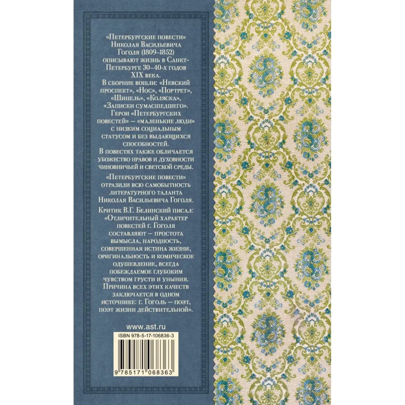 "Петербургские повести" Николая Васильевича Гоголя (1891852) описывают жизнь в Санкт-Петербурге 34-х годов XIX века. В сборник вошли: "Невский проспект", "Нос", "Портрет", "Шинель", "Коляска", "Записки сумасшедшего". Герои "Петербургских повестей" "маленькие люди" с низким социальным статусом и без выдающихся способностей. В повестях также обличается убожество нравов и духовности чиновничьей и светской среды. "Петербургские повести" отразили всю самобытность литературного таланта Николая Васильевича Гоголя. Критик В.Г. Белинский писал: "Отличительный характер повестей г. Гоголя составляют простота вымысла, народность, совершенная истина жизни, оригинальность и комическое одушевление, всегда побеждаемое глубоким чувством грусти и уныния. Причина всех этих качеств заключается в одном источнике: г. Гоголь поэт, поэт жизни действительной".