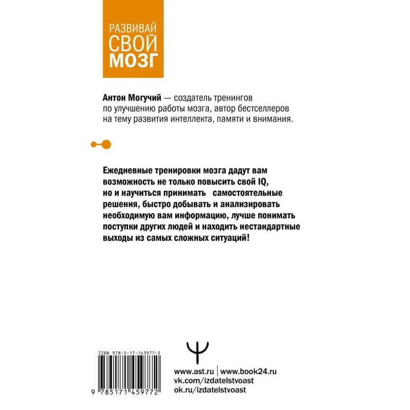 Новая книга Антона Могучего, известного автора тренажеров для повышения эффективности работы мозга, Тренажер мозга по методикам СССР. Память, внимание, интеллект это авторский тренинг, основанный на методиках Келли и Шульте и заданиях советской школы. Сочетание советских методик и заданий из тренажеров Келли и Шульте дают потрясающий результат. Тренируясь по 51 минут в день по книге Антона Могучего, выполняя задания тренажера Келли и занимаясь с таблицами Шульте, решая задачи, которые создавались для советских школьников, вы получите возможность повысить эффективность работы мозга и сохранить ясный ум на долгие годы.