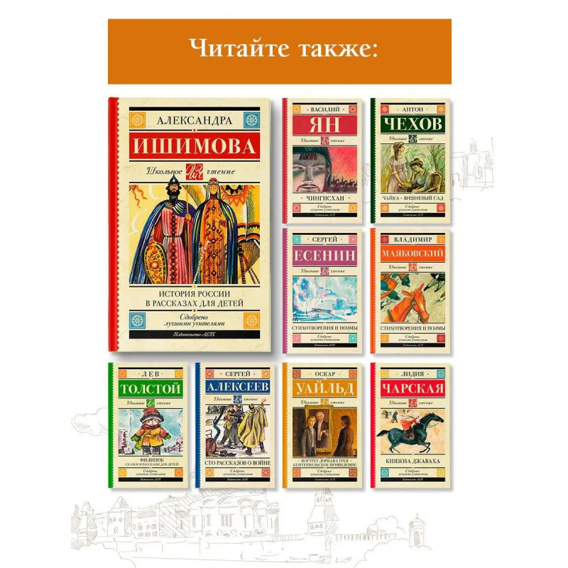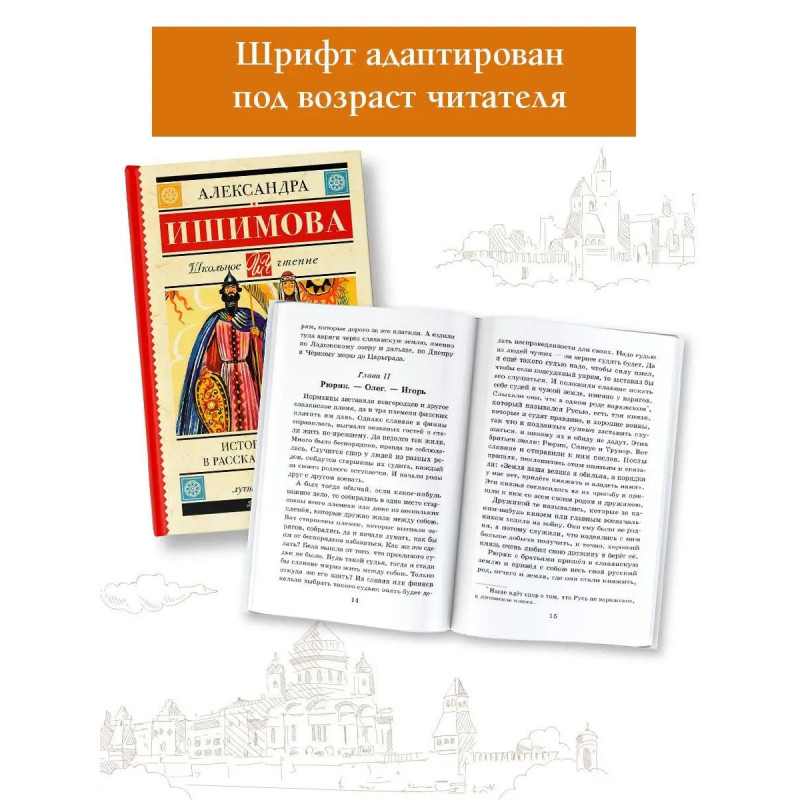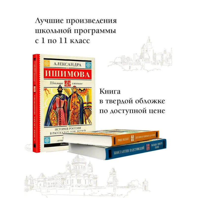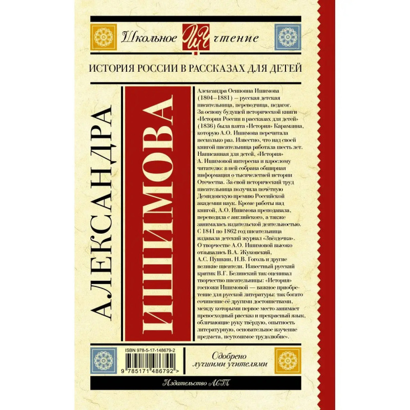 Думаете, как увлечь школьника историей России? История России для детей писательницы, преподавательницы и переводчицы Александры Осиповны Ишимовой легко заинтересует историей Отечества не только детей, но и взрослых. Вы узнаете о княгине Ольге и князе Владимире, смутном времени и блестящем дворе Екатерины Великой, итальянском походе Суворова и царствовании Александра I. История России никогда не была столь увлекательной! В серию включены лучшие произведения отечественной и зарубежной литературы, входящие в школьную программу с 1 по 11 класс и в списки дошкольного чтения. Книги в твердом переплёте сделают знакомство с литературой легким и увлекательным. Серия, которая не ударит по семейному бюджету и поможет юному читателю расти нравственно и интеллектуально!
