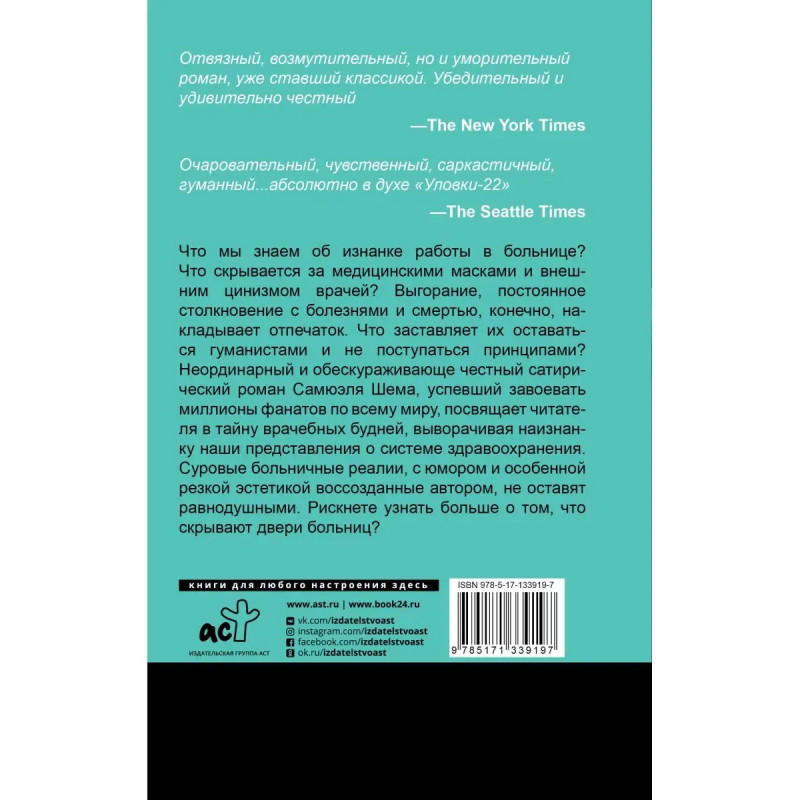 Отвязный, возмутительный, но и уморительный роман, уже ставший классикой. Убедительный и удивительно честный The New York Times Очаровательный, чувственный, саркастичный, гуманный...абсолютно в духе "Уловки-22" The Seattle Times Что мы знаем об изнанке работы в больнице? Что скрывается за медицинскими масками и внешним цинизмом врачей? Выгорание, постоянное столкновение с болезнями и смертью, конечно, накладывает отпечаток. Что заставляет их оставаться гуманистами и не поступаться принципами? Неординарный и обескураживающе честный сатирический роман Самюэля Шема, успевший завоевать миллионы фанатов по всему миру, посвящает читателя в тайну врачебных будней, выворачивая наизнанку наши представления о системе здравоохранения. Суровые больничные реалии, с юмором и особенной резкой эстетикой воссозданные автором, не оставят равнодушными. Рискнете узнать больше о том, что скрывают двери больниц?