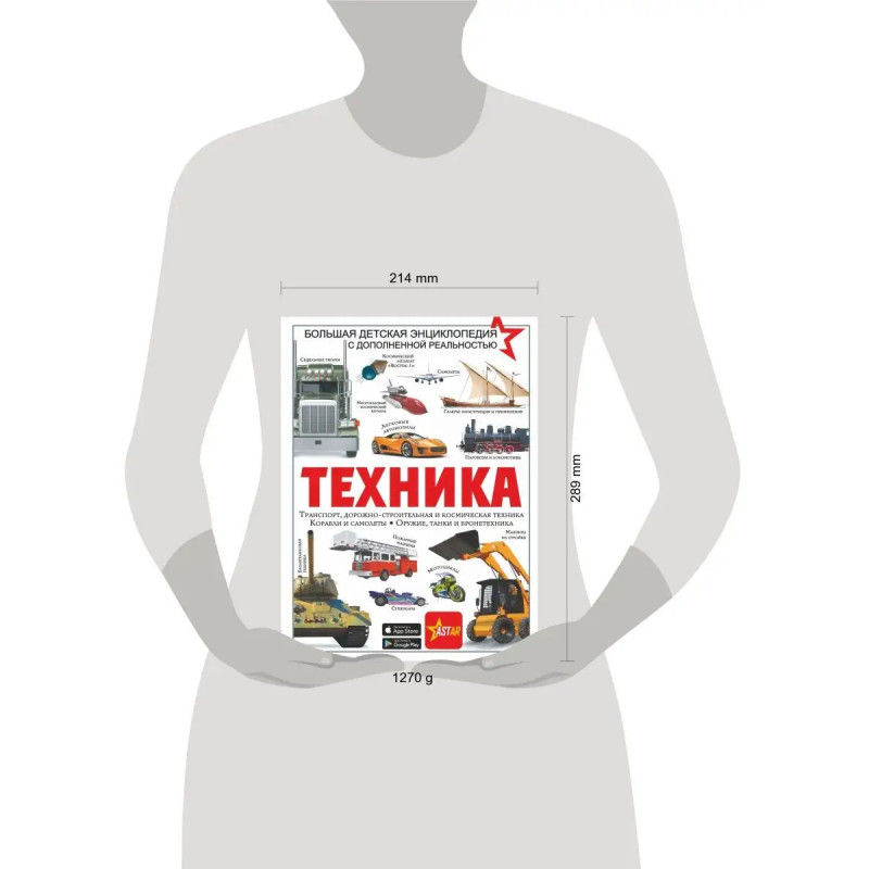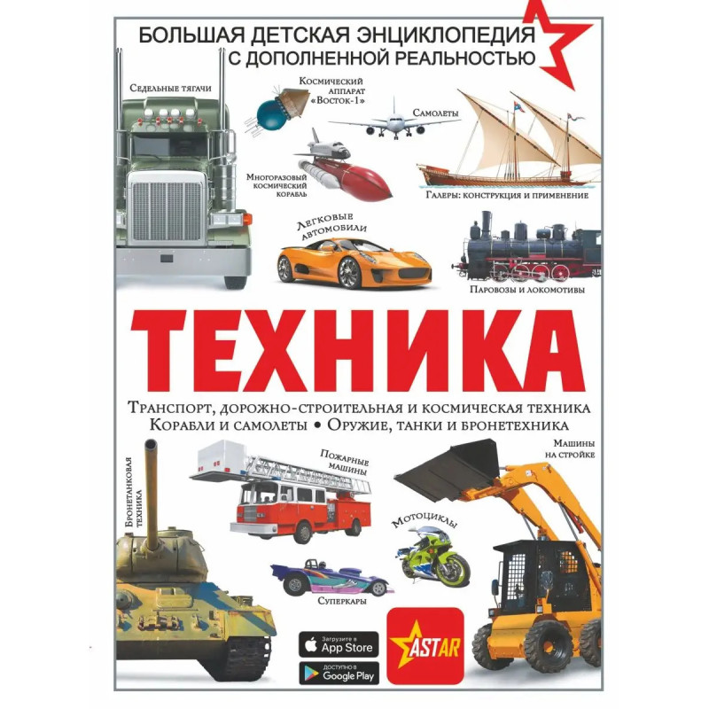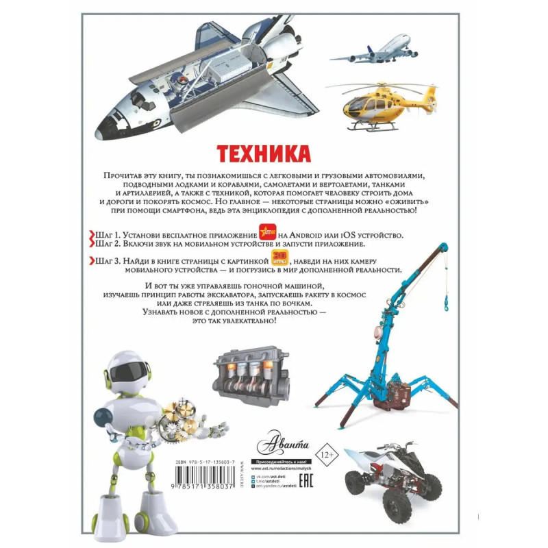 Вы наверняка интересуетесь техникой. И правильно, ведь людям без нее не обойтись. На общественном транспорте мы ездим в школу, в гости к друзьям, в маггазины, а чтобы преодолеть дальние расстояния, пересаживаемся на поезда, самолеты или корабли. С помощью дорожно-строительной техники вырастают города и проходят дороги там, где раньше росли необходимые леса. А с помощью космической техники человек покоряет космос. Есть и еще один вид техники - боевой. Она стоит на страже мира и порядка. Полистайте страницы нашей гигантской энциклопедии, и вы познакомитесь поближе с разными видами техники. Причем сможете не только увидеть все это на наших красочных иллюстрациях и прочесть описания, но и детально рассмотреть в объеме и движении. Разобраться, как работает нефтедобывающая платформа, увидеть своими глазами, как произошло крушение "Титаника", запустить ракету в космос, управлять танком и самолетом - это и многое другое станет доступно вам с нашей гигантской 3D-энциклопедией с дополненной реальностью. И всем этим буд