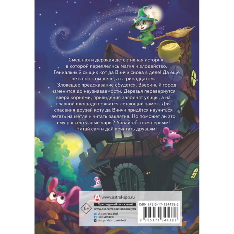 Смешная и дерзкая детективная история, в которой переплелись магия и злодейство. Гениальный сыщик кот да Винчи снова в деле! Да ещё не в простом деле, а в тринадцатом. Зловещее предсказание сбудется. Звериный город изменится до неузнаваемости. Деревья перевернутся вверх корнями, привидения заполнят улицы, а на Главной площади появится летающий замок. Для спасения друзей коту да Винчи придётся научиться летать на метле и читать заклятия. Но поможет ли это ему рассеять злые чары? Узнай об этом первым! Читай сам и дай почитать друзьям!