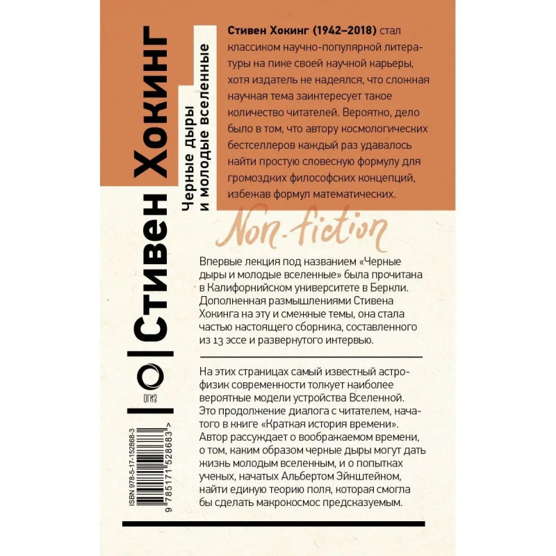 Впервые лекция под названием "Черные дыры и молодые вселенные" была прочитана в Калифорнийском университете в Беркли. Дополненная размышлениями Стивена Хокинга на эту и смежные темы, она стала частью настоящего сборника, составленного из 13 эссе и развернутого интервью. На этих страницах самый известный астрофизик современности толкует наиболее вероятные модели устройства Вселенной. Это продолжение диалога с читателем, начатого в книге "Краткая история времени". Автор рассуждает о воображаемом времени, о том, каким образом черные дыры могут дать жизнь молодым вселенным, и о попытках ученых, начатых Альбертом Эйнштейном, найти единую теорию поля, которая смогла бы сделать макрокосмос предсказуемым.