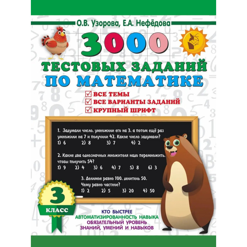 Пособие известных педагогов-практиков, авторов самых издаваемых учебников и учебных пособий в России О.В. Узоровой и Е.А. Нефёдовой содержит тестовые задания по всем основным темам курса математики для 3 класса. Для каждой изученной темы предложены тесты, позволяющие проверить, как ученик её усвоил. Данные тесты с первого класса готовят ребёнка к последующим тестовым испытаниям, в том числе к ГИА и ЕГЭ.Особннностью данного издания является крупный шрифт. При самостоятельной работе с пособием ребенок может проверить выполненный тест по ответам в конце книги.Тесты можно использовать на уроке в школе, а также для самостоятельной работы дома.