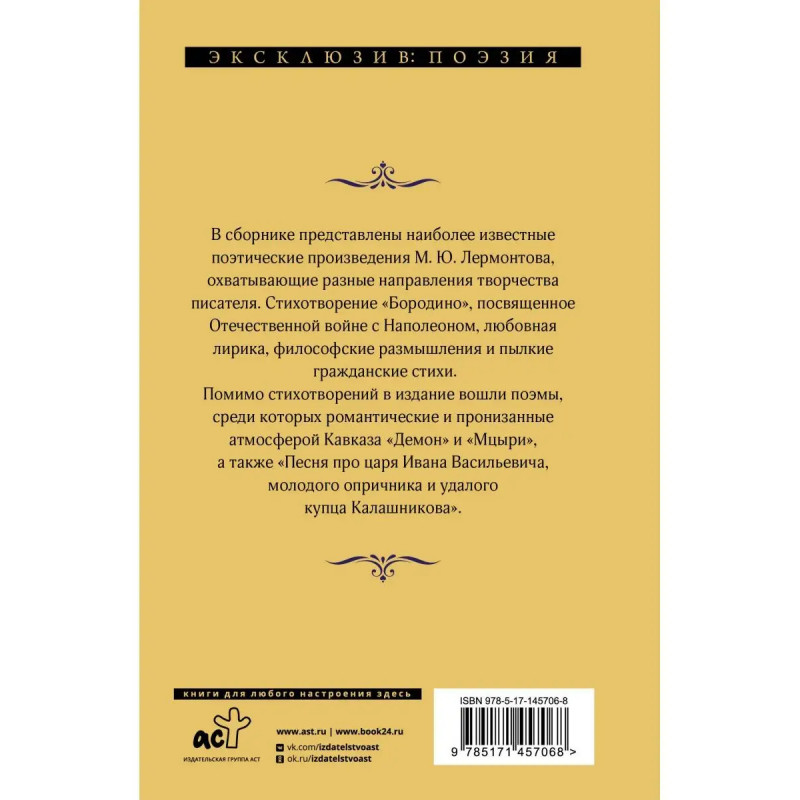 В сборнике представлены наиболее известные поэтические произведения М. Ю. Лермонтова, охватывающие разные направления творчества писателя. Стихотворение "Бородино", посвященное Отечественной войне с Наполеоном, любовная лирика, философские размышления и пылкие гражданские стихи. Помимо стихотворений в издание вошли поэмы, среди которых романтические и пронизанные атмосферой Кавказа "Демон" и "Мцыри", а также "Песня про царя Ивана Васильевича, молодого опричника и удалого купца Калашникова".