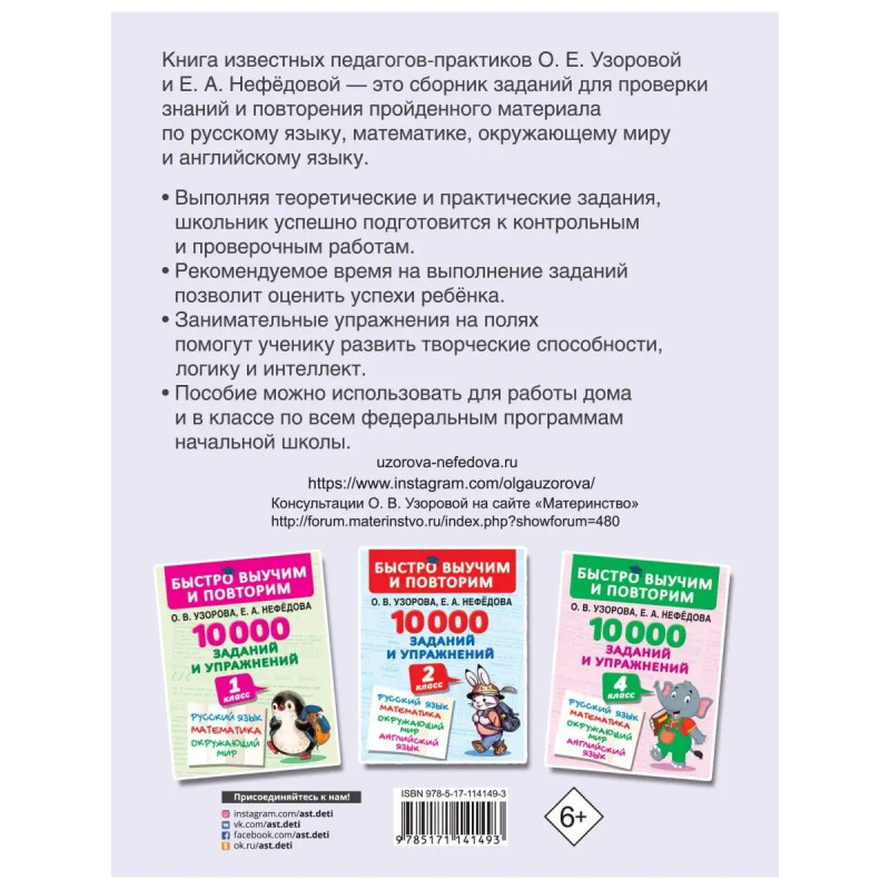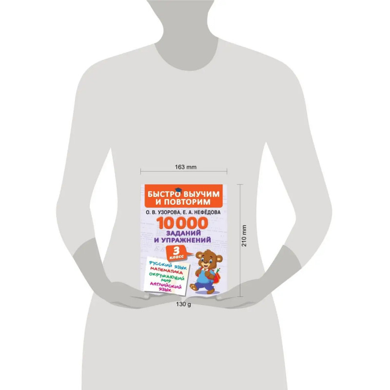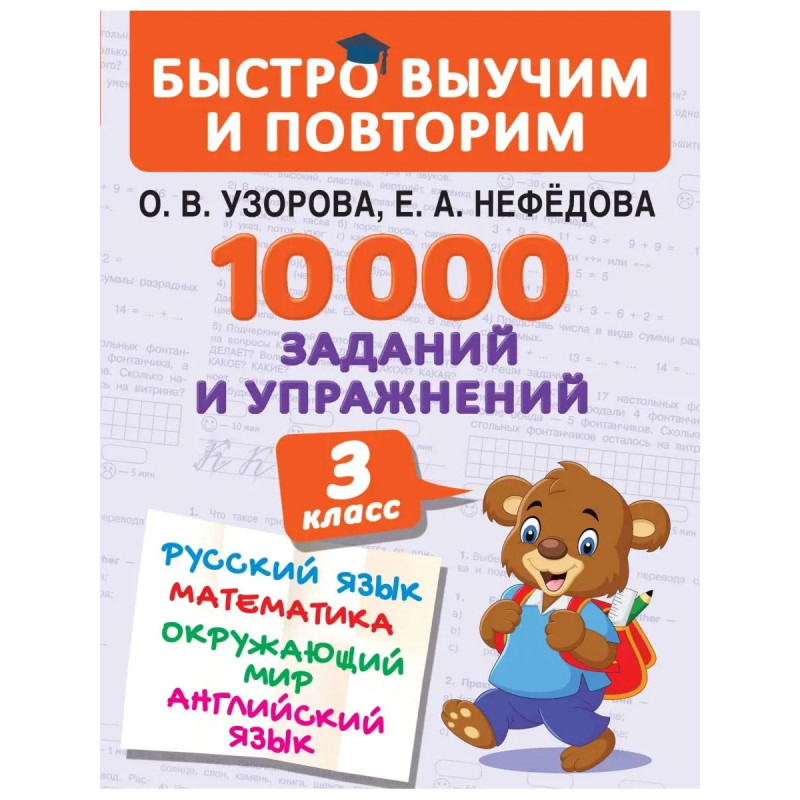 О чём эта книгаКнига известных педагогов-практиков О. Е. Узоровой и Е. А. Нефёдовой 10000 заданий и упражнений. 3-й класс. Русский язык. Математика. Окружающий мир. Английский язык это сборник заданий для проверки знаний и повторения пройденного материала по предметам Русский язык, Математика, Окружающий мир и Английский язык.Выполняя задания и решая примеры, ученик закрепит знания, полученные в процессе обучения. Занимательные упражнения на полях книги помогут школьнику потренировать интеллект и логику, развить творческие способности.Кому эта книга будет интереснаСборник заданий для учеников младших классов.Каковы особенности этой книги Задания по предметам Русский язык, Математика, Окружающий мир и Английский язык в одной книге. Упражнения на полях помогут ребёнку потренировать интеллект и логику, развить творческие способности. Рекомендуемое время на выполнение заданий позволит узнать, какие упражнения даются ученику легко, а какие вызывают затруднение. Пособие можно исп