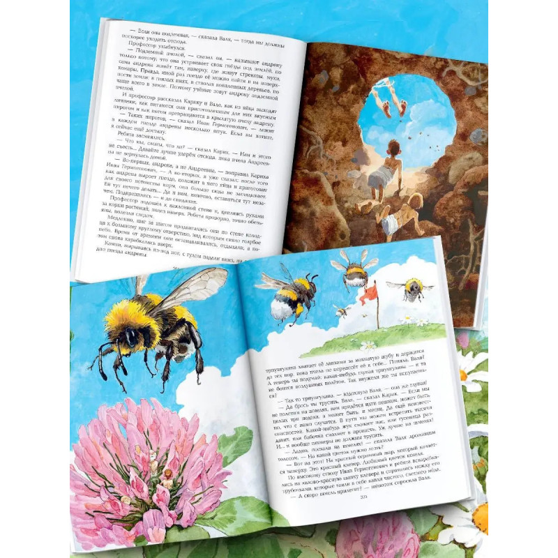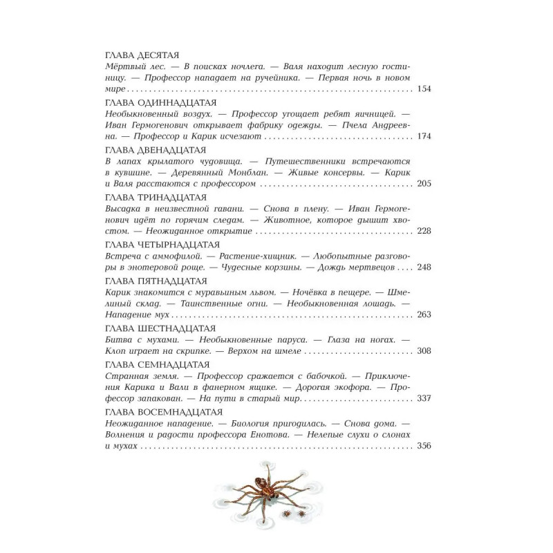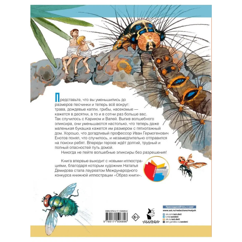 Представьте, что вы уменьшились до размеров песчинки и теперь всё вокруг: трава, дождевые капли, грибы, насекомые кажется в десятки, а то и в сотни раз больше вас. Так случилось с Кариком и Валей. Выпив волшебного эликсира, они уменьшаются настолько, что теперь даже маленькая букашка кажется им размером с пятиэтажный дом. Хорошо, что догадливый профессор Иван Гермогенович Енотов понял, что случилось, и незамедлительно отправился на поиски ребят. Впереди героев ждёт долгий, трудный и полный опасностей путь домой. Никогда не пейте волшебные эликсиры без разрешения! Книга впервые выходит с новыми иллюстрациями, благодаря которым художник Наталья Демидова стала лауреатом Международного конкурса книжной иллюстрации Образ книги.