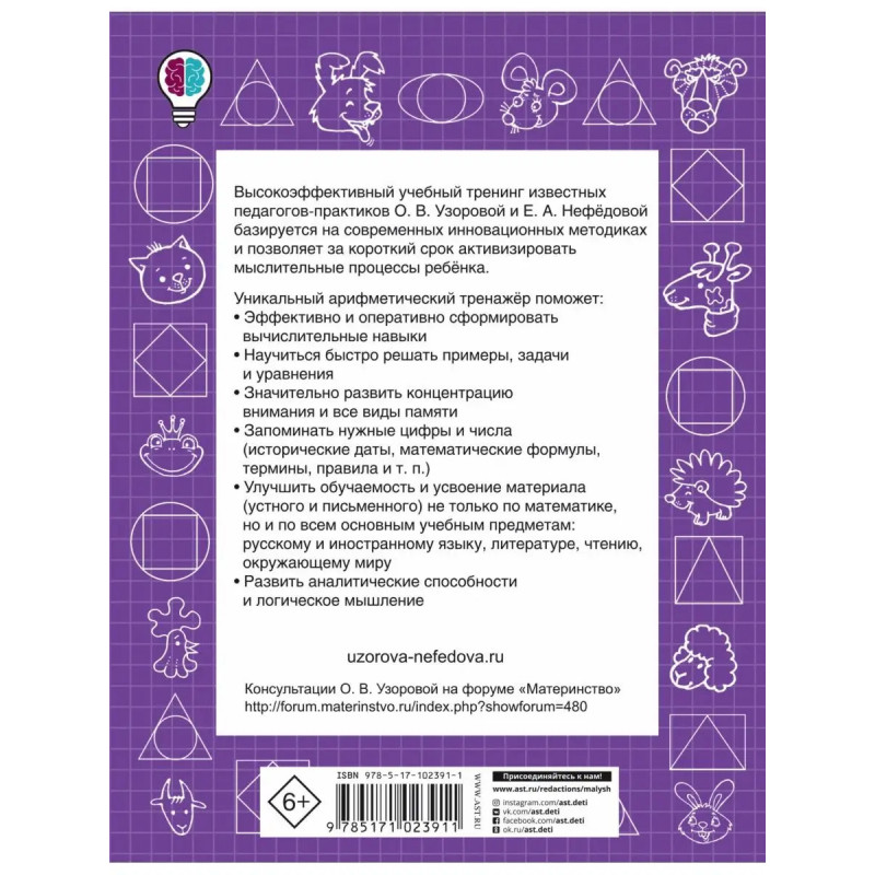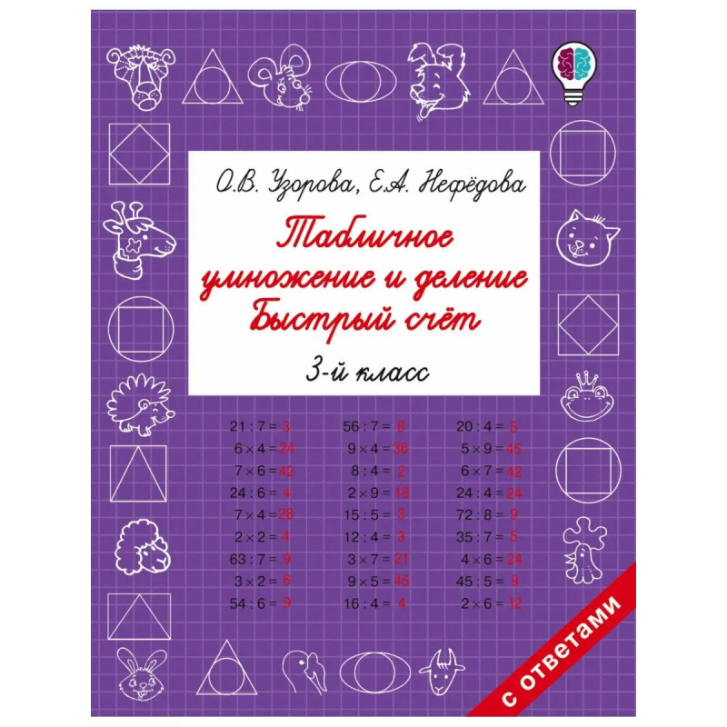 УТП Учебное пособие основано на авторской методике известных педагогов-практиков О. В. Узоровой и Е. А. Нефёдовой. Книга поможет ребёнку автоматизировать навык счёта, выучить таблицу умножения и деления. Книга представляет интерес для педагогов и родителей младших школьников: поможет развить вычислительные навыки ребёнка, а также может использоваться при подготовке к урокам. - Уникальный арифметический тренажёр позволит оценить достижения третьеклассников по математике. - Материал строится по принципу Одна страница книги на каждое занятие. - Сборник представляет собой учебное пособие и рабочую тетрадь одновременно - решения примеров можно вписывать простым карандашом и аккуратно стирать, при этом ребёнок не боится ошибиться, активно включается в работу, лучше запоминает алгоритм вычислений. - Благодаря ежедневным занятиям по 20 - 30 минут ученик сможет автоматизировать навык табличного счёта и эффективно применять эти знания на уроках.