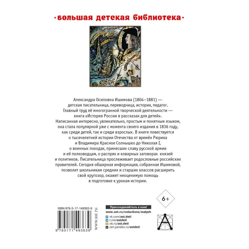 Александра Осиповна Ишимова (1841881) рус- ская детская писательница, переводчица, педагог. За основу будущей исторической книги "История России в рассказах для детей" (1836) была взята "История" Карам- зина, которую А.О. Ишимова перечитала несколько раз. Известно, что над своей книгой писательница работала шесть лет. Написанная для детей, "История" А. Ишимовой интересна и взрослому читателю: в ней собрана обширная информация о тысячелетней истории Отечества. За свой исторический труд писательница получила почётную Де- мидовскую премию Российской академии наук. Кроме работы над книгой, А.О. Ишимова преподавала, переводила с английского, а также занималась издатель- ской деятельностью. С 1841 по 1862 год писательница из- давала детский журнал "Звёздочка". О творчестве А.О. Ишимовой высоко отзывались В.А. Жуковский, А.С. Пушкин, Н.В. Гоголь и другие ве- ликие писатели. Известный русский критик В.Г. Белинский так оцени- вал творчество писательницы: "История" госпожи Иши- мовой важное приобретение для русско