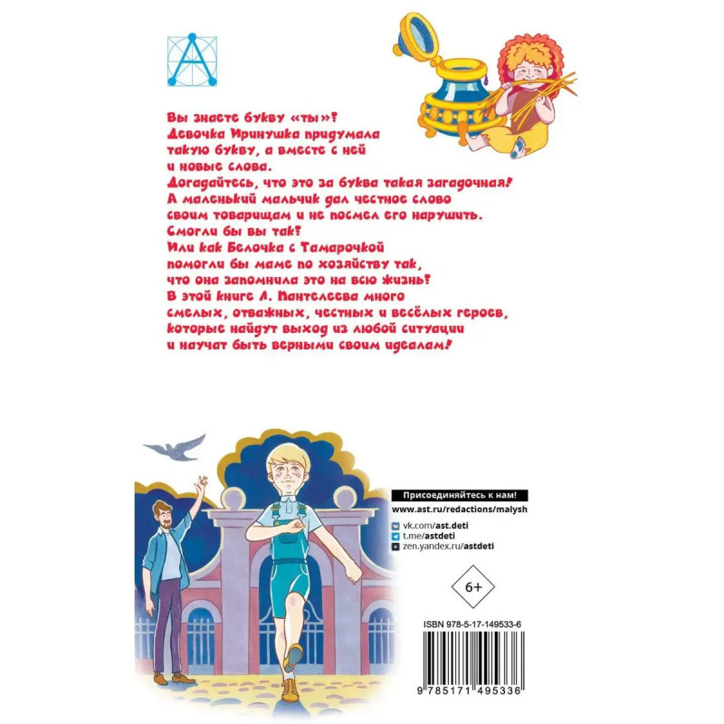 Вы знаете букву ты? Девочка Иринушка придумала такую букву, а вместе с ней и новые слова. Догадайтесь, что это за буква такая загадочная! А маленький мальчик дал честное слово своим товарищам и не посмел его нарушить. Смогли бы вы так? Или как Белочка с Тамарочкой помогли бы маме по хозяйству так, что она запомнила это на всю жизнь? В этой книге Л. Пантелеева много смелых, отважных, честных и весёлых героев,которые найдут выход из любой ситуации и научат быть верными своим идеалам!