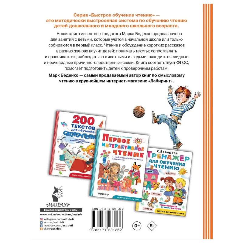 Новая книга известного педагога Марка Беденко, адресована родителям, чьи дети учатся в начальной школе или только собираются в первый класс. Чтение и обсуждение коротких рассказов в разных жанрах научит детей: понимать тексты; сопоставлять и сравнивать их; наблюдать за животными и людьми; находить очевидные и неочевидные причинно-следственные связи. Книга соответствует ФГОС, помогает подготовить детей к проверочным работам. Марк Беденко самый продаваемый автор книг по смысловому чтению в "Лабиринте". Для старшего дошкольного и младшего школьного возраста